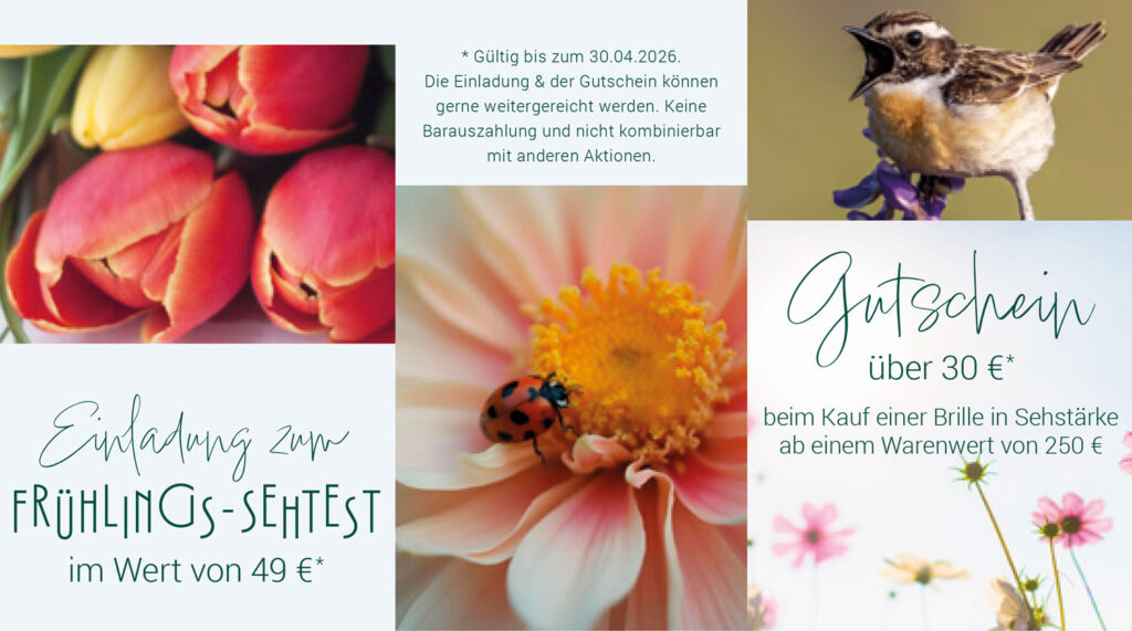 Wir von Franz Zimmermann Augenoptik laden Sie ganz herzlich ein, Ihre Sehkraft bei uns überprüfen zu lassen und schenken Ihnen dazu noch einen Frühlings-Gutschein über 30 € für eine neue “Lieblingsbrille”. Starten Sie mit uns und bestem Sehen in den Frühling!